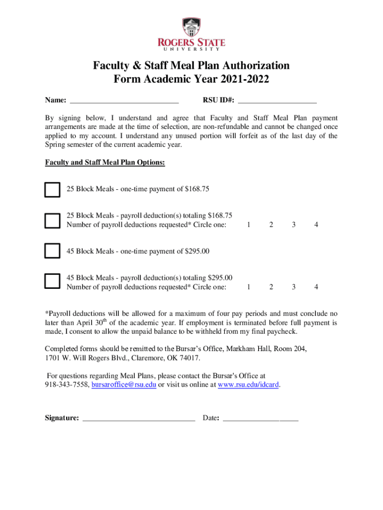 Faculty & Staff Meal Plan Authorization Form Academic Year 20212022 Name: RSU ID#: By signing below, I understand and agree that Faculty and Staff Meal Plan payment arrangements are made at the time