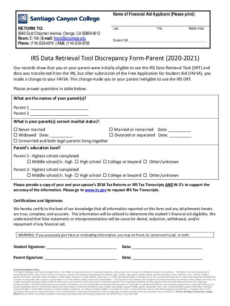 Get the free IRS Data Retrieval Tool Discrepancy Form-Parent (2020-2021)