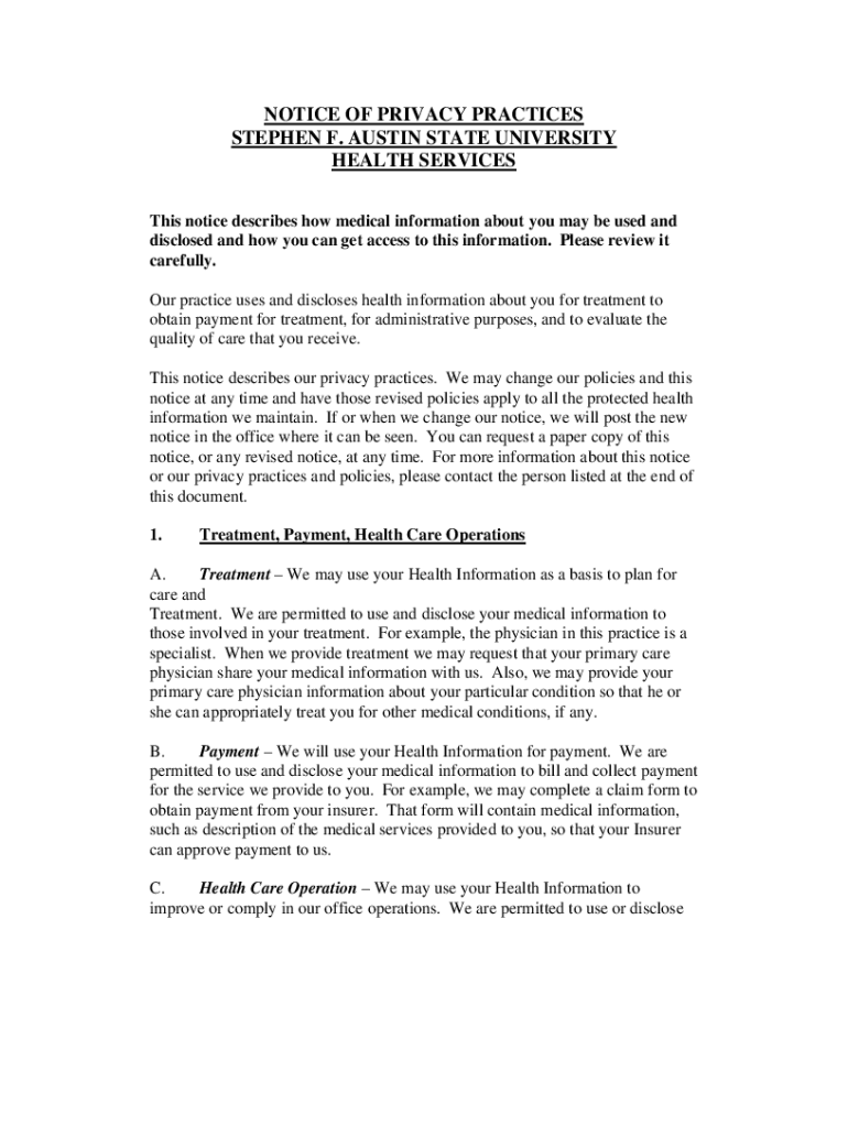 Get the free NOTICE OF PRIVACY PRACTICES STEPHEN F. AUSTIN STATE ...