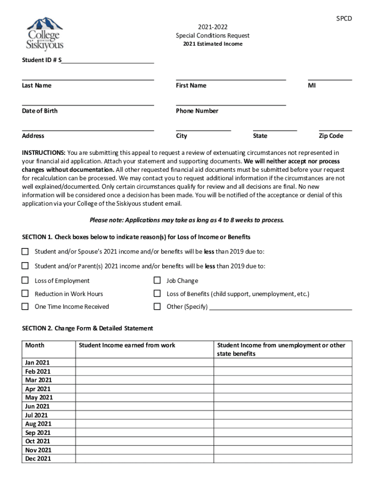 SPED 20212022 Special Conditions Request 2021 Estimated IncomeStudent ID # Last NameFirst Nameplate of Birthstone NumberAddressCityStateZip Constructions: You are submitting this appeal to request