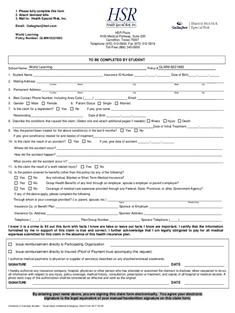 1. Please fully complete this form 2. Attach itemized bills 3. Mail to: Health Special Risk, Inc. Email: Gallagher hsri.com HER Plaza 4100 Medical Parkway, Suite 200 Carrollton, Texas 75007 Telephone