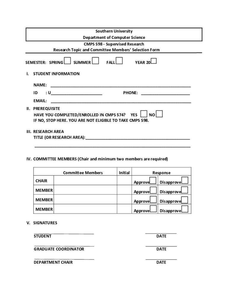 Southern University Department of Computer Science CAMPS 598 Supervised Research Topic and Committee Members Selection Form SEMESTER: SPRINGSUMMERFALLYEAR 20I. STUDENT INFORMATION NAME: ID: U PHONE: