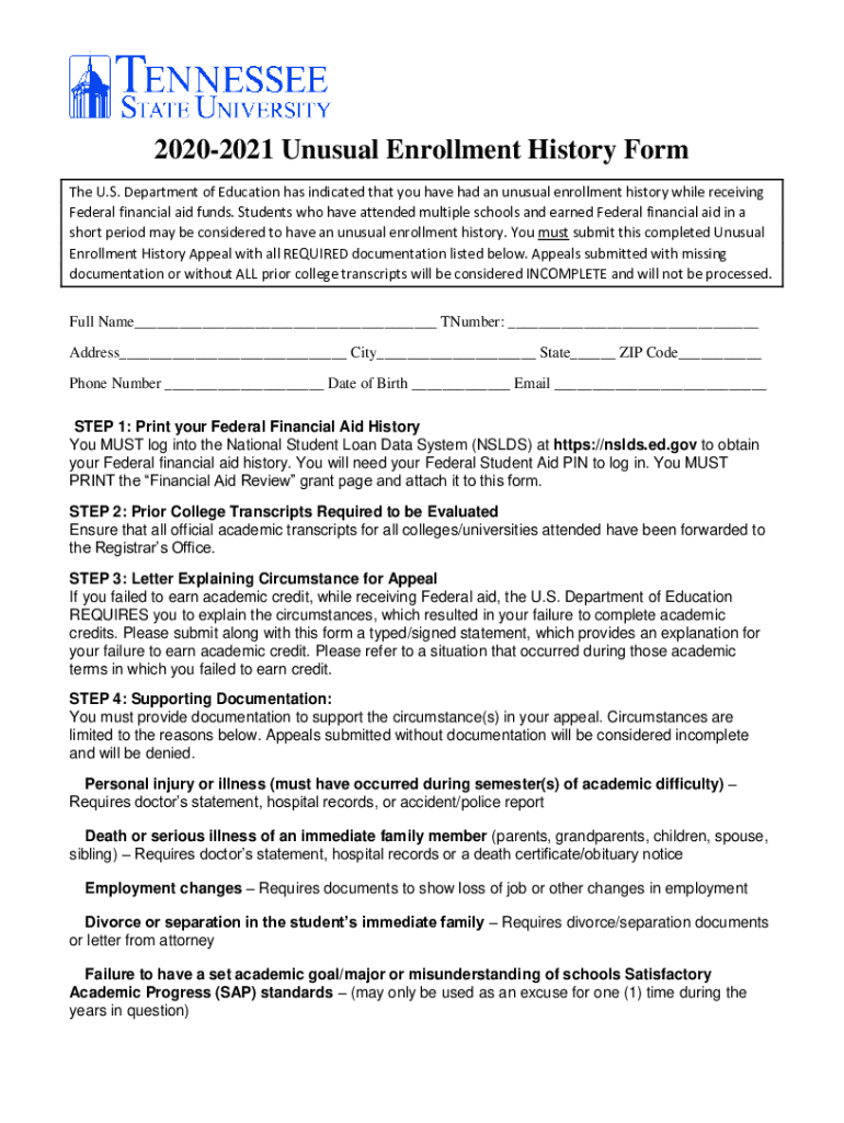 20202021 Unusual Enrollment History Form The U.S. Department of Education has indicated that you have had an unusual enrollment history while receiving Federal financial aid funds. Students who have