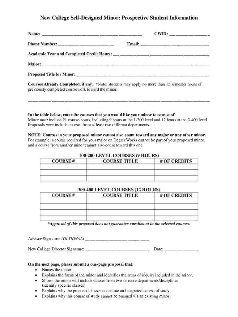 New College Redesigned Minor: Prospective Student Information Name: Phone Number: CID: Email: Academic Year and Completed Credit Hours: Major: Proposed Title for Minor: Courses Already Completed,