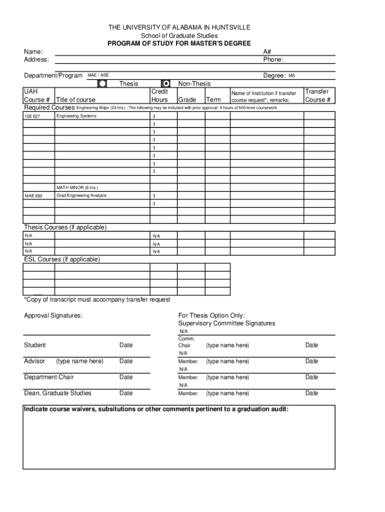 THE UNIVERSITY OF ALABAMA IN HUNTSVILLE School of Graduate Studies PROGRAM OF STUDY FOR MASTER\'S DEGREE A# Phone:Name: Address: Department/ProgramDegree:MAE / Anesthesia Synthesis UAH Credit Name