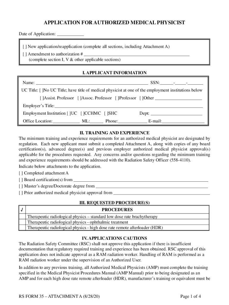 APPLICATION FOR AUTHORIZED MEDICAL PHYSICIST Date of Application: New application/reapplication (complete all sections, including Attachment A) Amendment to authorization # (complete section I, V