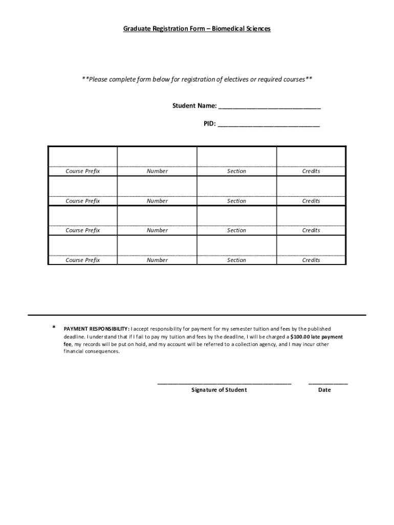 Graduate Registration Form Biomedical Sciences**Please complete form below for registration of electives or required courses** Student Name: PID: *Course PrefixNumberSectionCreditsCourse PrefixNumberSectionCreditsCourse