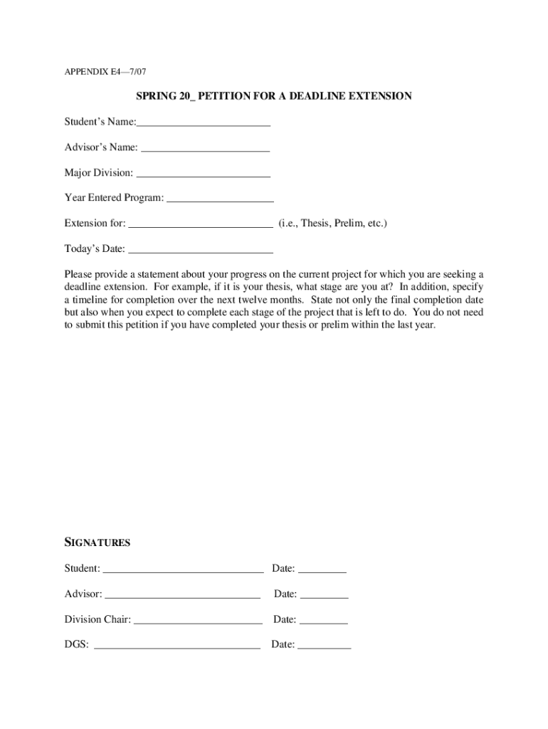 APPENDIX E47/07SPRING 20 PETITION FOR A DEADLINE EXTENSION Students Name: Advisors Name: Major Division: Year Entered Program: Extension for: (i.e., Thesis, Prelim, etc.) Today's Date: Please provide