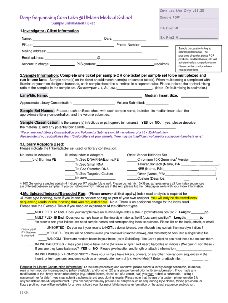 Core Lab Use Only v11.20 Sample ID# BA File1 #1. Investigator / Client Information Name:BA File2 #Date:PI/Lab:Phone Number:Mailing address: Email address:account to charge:PI Signature:(required)Sample