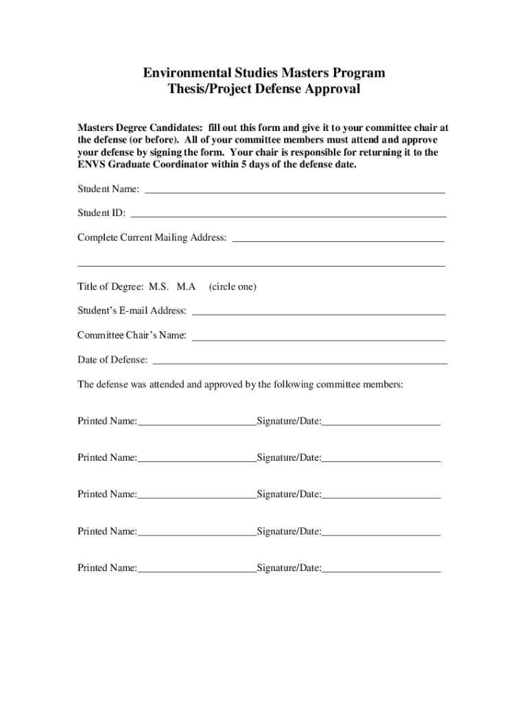 Environmental Studies Masters Program Thesis/Project Defense Approval Master s Degree Candidates: fill out this form and give it to your committee chair at the defense (or before). All of your committee