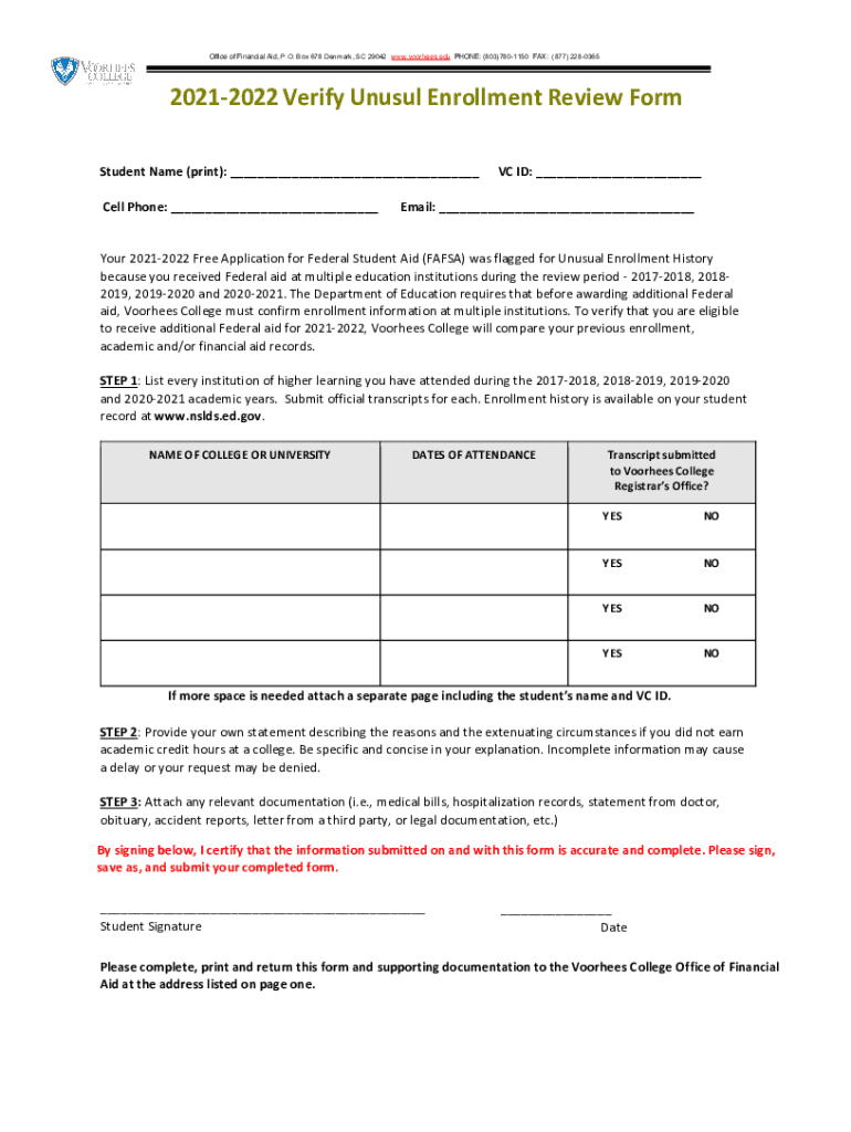 Office of Financial Aid, P.O. Box 678 Denmark, SC 29042 www.voorhees.edu PHONE: (803)7801150 FAX: (877) 228036520212022 Verify Unusual Enrollment Review Form Student Name (print): Cell Phone: VC ID:
