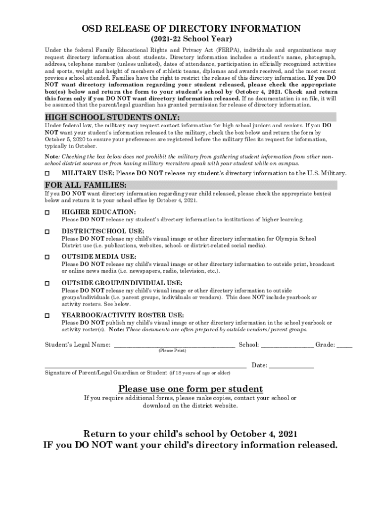 OSD RELEASE OF DIRECTORY INFORMATION (202122 School Year) Under the federal Family Educational Rights and Privacy Act (FER PA), individuals and organizations may request directory information about