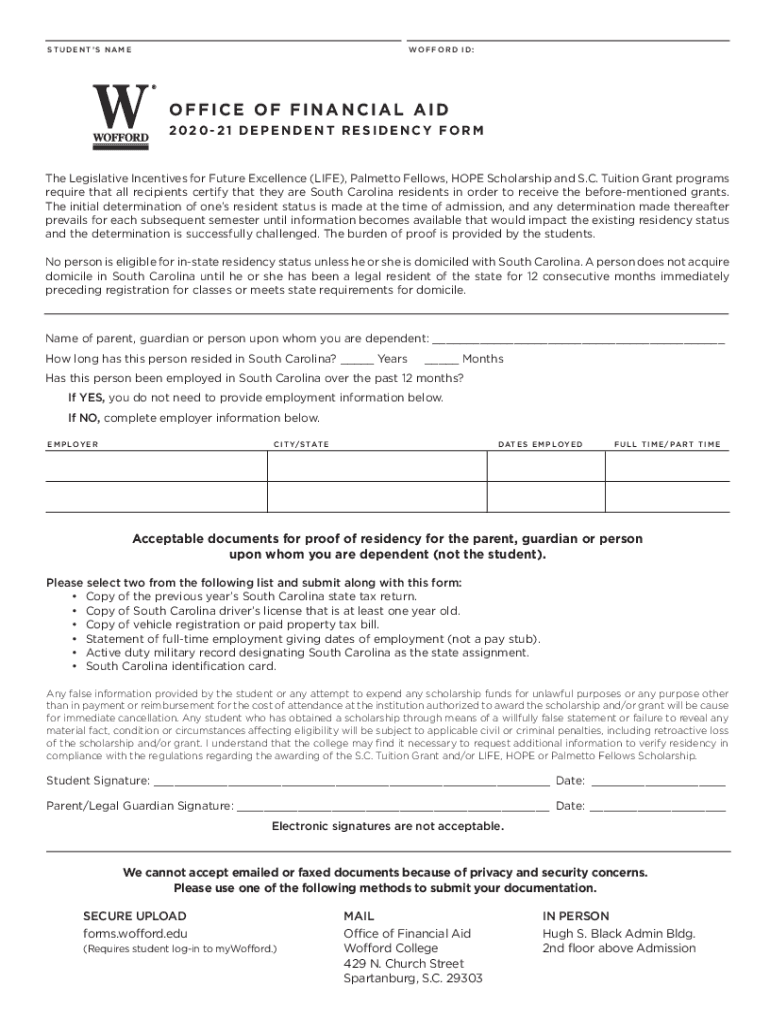 STUDENTS NAME F O R D I D :OFFICE OF FINANCIAL AID 202021 DEPENDENT RESIDENCY FORM The Legislative Incentives for Future Excellence (LIFE), Palmetto Fellows, HOPE Scholarship and S.C. Tuition Grant