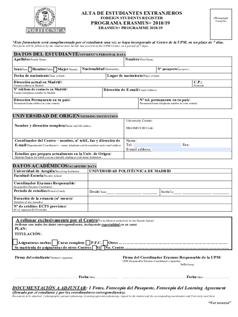 ALTA DE ESTUDIANTES EXTRANEOUS FOREIGN STUDENTS REGISTER(Photograph/ Topography)PROGRAM ERASMUS+ 2018/19 ERASMUS+ Program 2018/19POLITCNICA×Ester formulation SER complimented POR el estudiante RNA