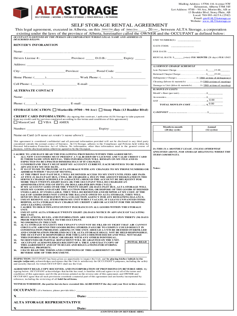 Get the free SELF STORAGE RENTAL AGREEMENT - ALTA STORAGEEdmonton's ...