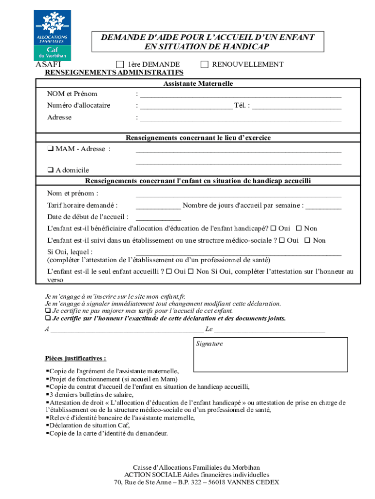 DEMAND D 'AIDE POUR LACQUER DUN ENFANT EN SITUATION DE HANDICAP c 1re DEMAND REASSIGNMENTS ADMINISTRATIFSASAFIc RENOUVELLEMENTNOM et PrnomAssistante Maternally : Humor d 'allocatable: Tl. Address: