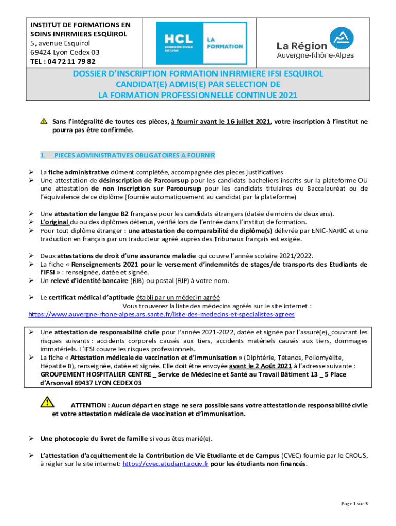 INSTITUTE DE FORMATIONS EN SONS INFIRM IERS ESQUIRE 5, avenue Esquire 69424 Lyon CEDEX 03 TEL : 04 72 11 79 82DOSSIER INSCRIPTION FORMATION INFIRMARY IFSI ESQUIRE CANDIDATE(E) ADMIT(E) PAR SELECTION