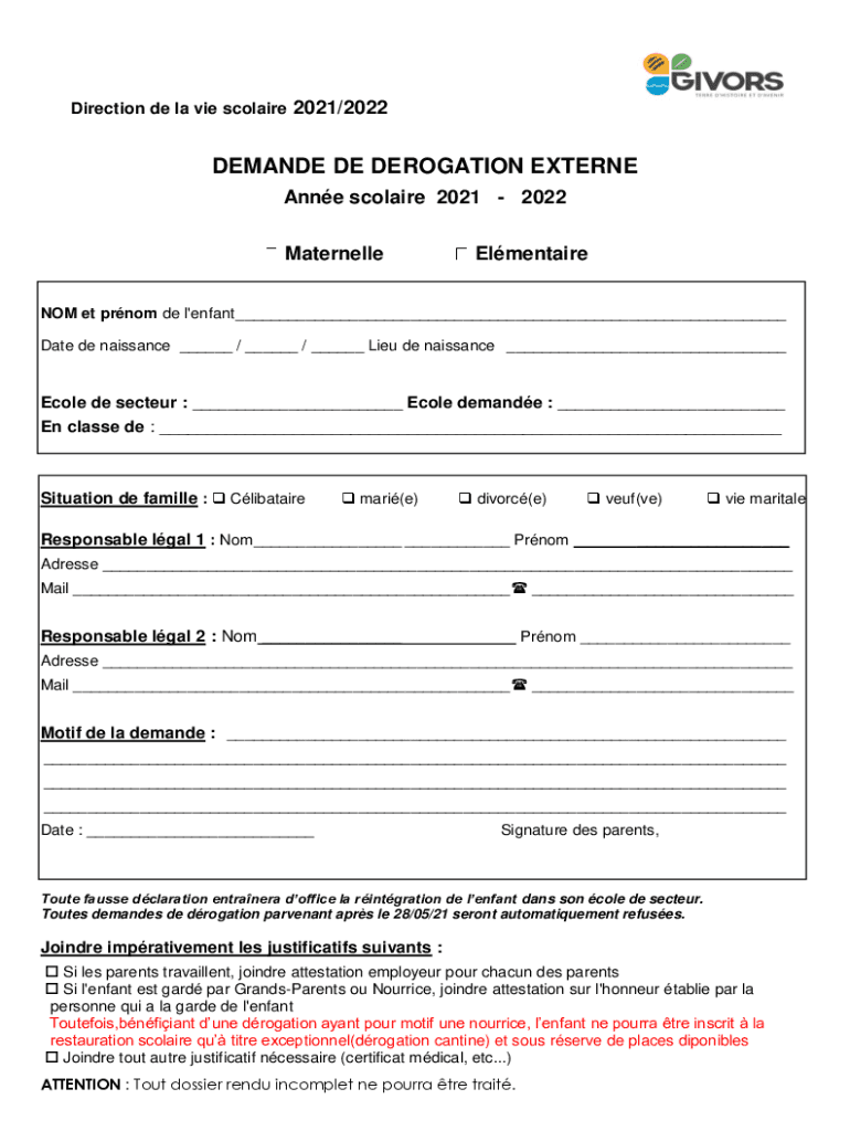 Direction DE la vie Claire 2021/2022DEMANDE DE DEROGATION EXTENT Anne Claire 2021 2022 MaternelleElmentaireNOM et prom de l 'Enfant Date de Renaissance / / Lieu de Renaissance Cole de sector : Cole