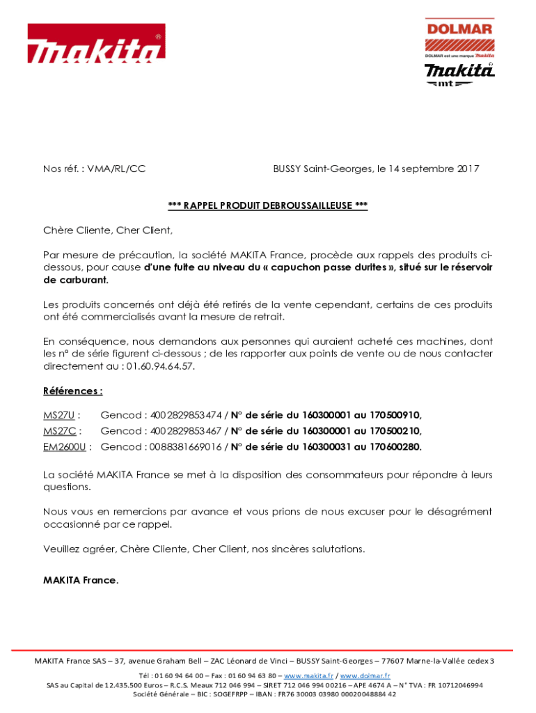 Nos RF. VMA/RL/DEBUSSY Saint Georges, LE 14 September 2017*** RAPPEL PRODUCT DEBROUSSAILLEUSE *** Care Client, Cher Client, Par measure DE precaution, la so cit AKITA France, provide aux rappels