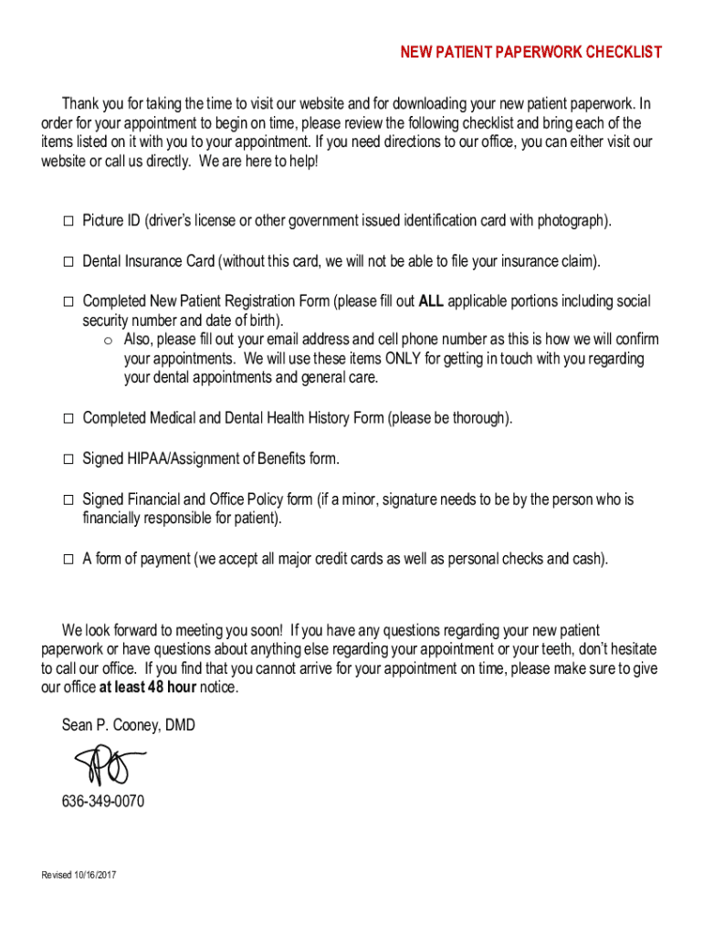 NEW PATIENT PAPERWORK CHECKLIST Thank you for taking the time to visit our website and for downloading your new patient paperwork. In order for your appointment to begin on time, please review the