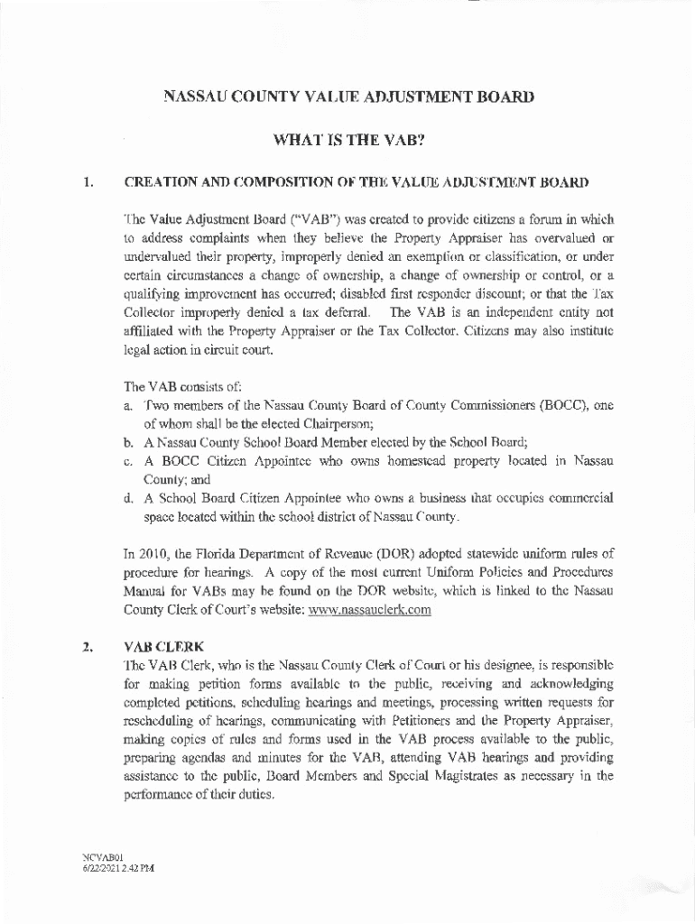 NASSAU COUNTY VALUE ADJUSTMENT BOARD WHAT IS THE VAB? 1.CREATION AND COMPOSITION OF THE VALUE ADJUSTMENT Board Value Adjustment Board (“VAB “) was created to provide citizens a forum in which