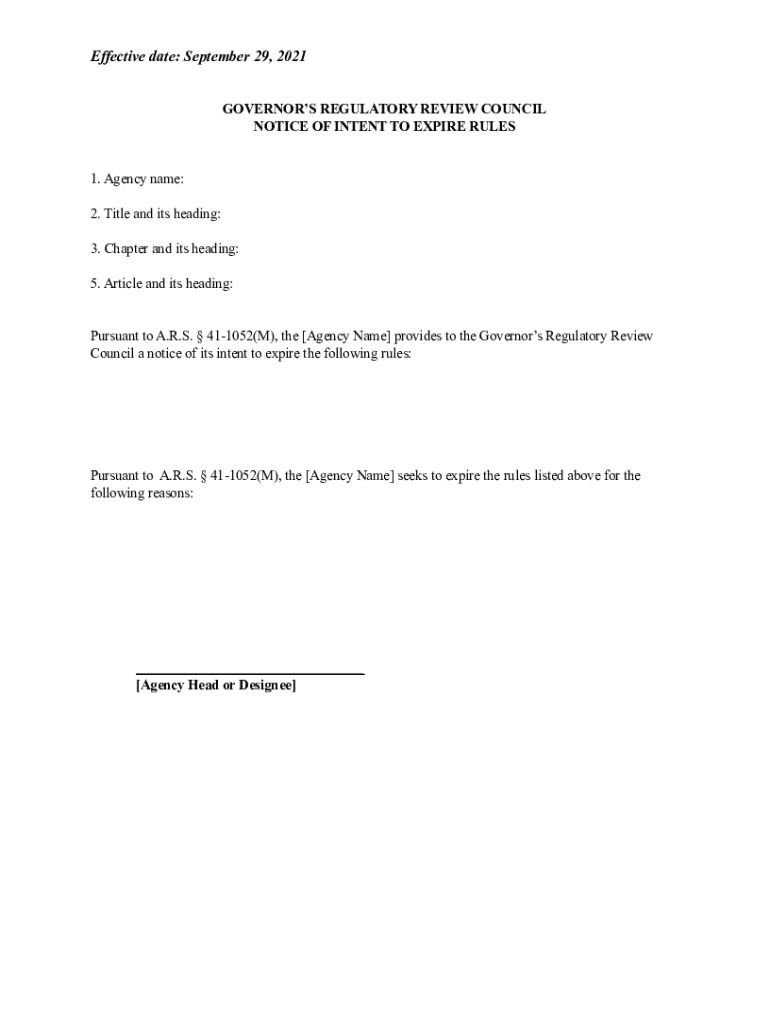 Effective date: September 29, 2021, GOVERNORS REGULATORY REVIEW COUNCIL NOTICE OF INTENT TO EXPIRE RULES1. Agency name: 2. Title and its heading: 3. Chapter and its heading: 5. Article and its heading:Pursuant
