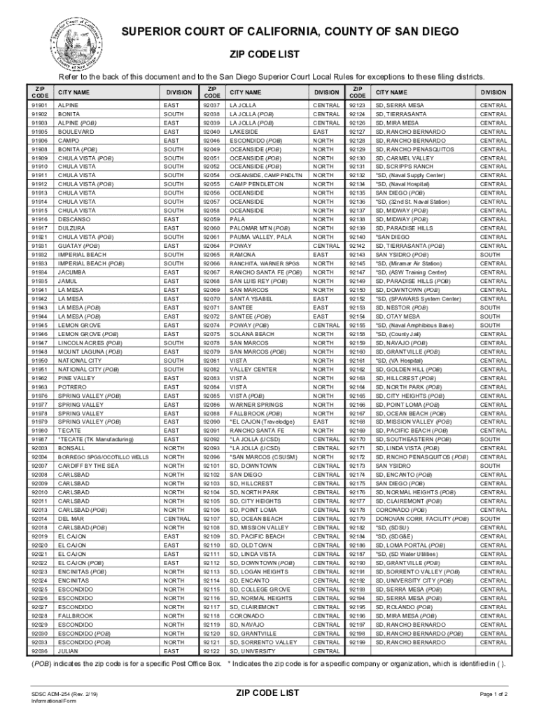 SUPERIOR COURT OF CALIFORNIA, COUNTY OF SAN DIEGO ZIP CODE LIST Refer to the back of this document and to the San Diego Superior Court Local Rules for exceptions to these filing districts. ZIP CAPACITY