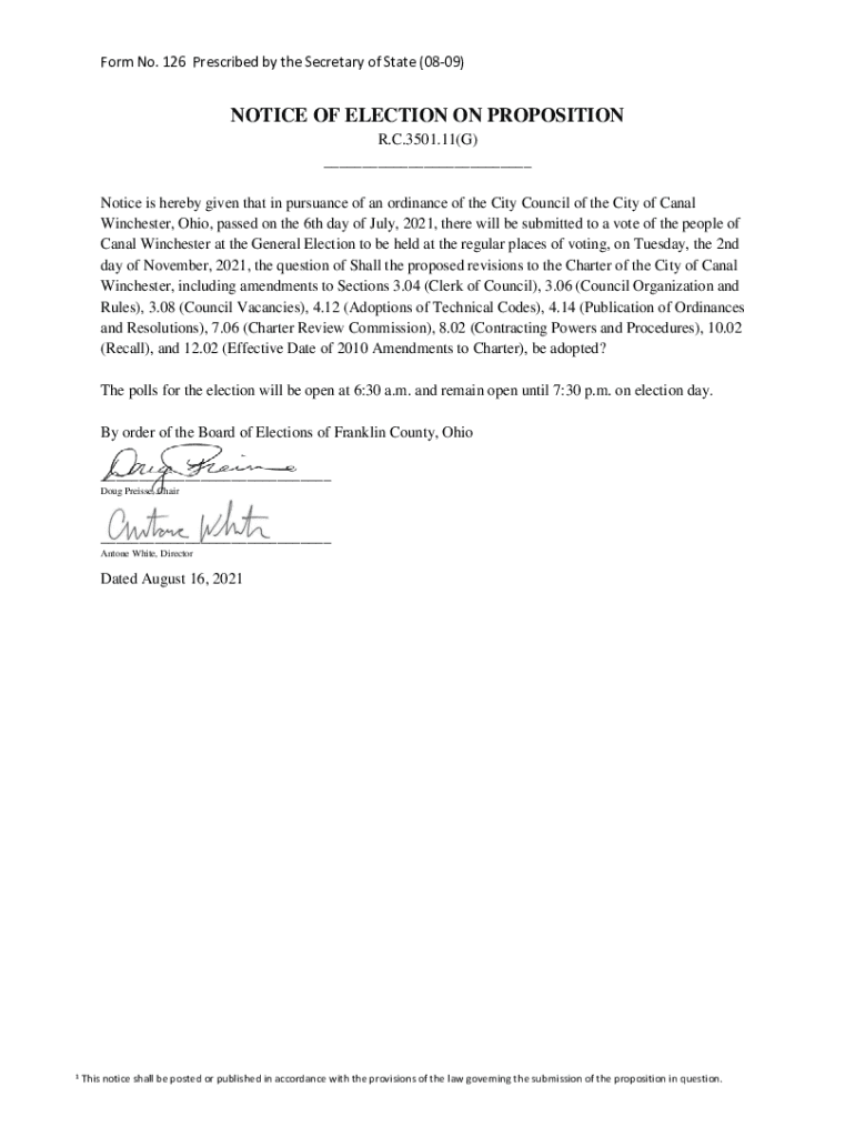Form No. 126 Prescribed by the Secretary of State (0809)NOTICE OF ELECTION ON PROPOSITION R.C.3501.11(G) Notice is hereby given that in pursuance of an ordinance of the City Council of the City of