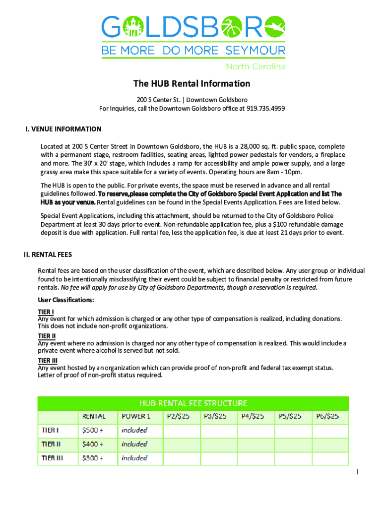 The HUB Rental Information 200 S Center St. Downtown Goldsboro For Inquiries, call the Downtown Goldsboro office at 919.735.4959I. VENUE INFORMATION Located at 200 S Center Street in Downtown Goldsboro,