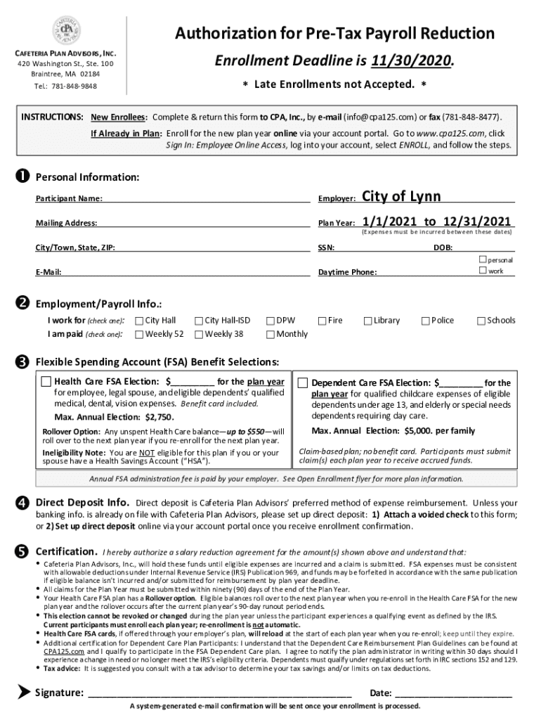 Authorization for Pretax Payroll Reduction CAFETERIA PLAN ADVISORS, INC. Enrollment Deadline is 11/30/2020.420 Washington St., Ste. 100 Braintree, MA 02184 Tel.: 7818489848* Late Enrollments not Accepted.