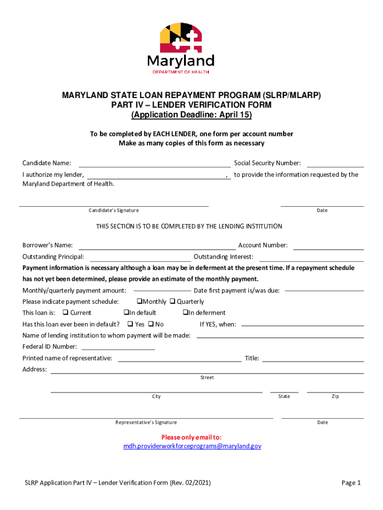MARYLAND STATE LOAN REPAYMENT PROGRAM (SLIP/MARP) PART IV LENDER VERIFICATION FORM (Application Deadline: April 15) To be completed by EACH LENDER, one form per account number Make as many copies