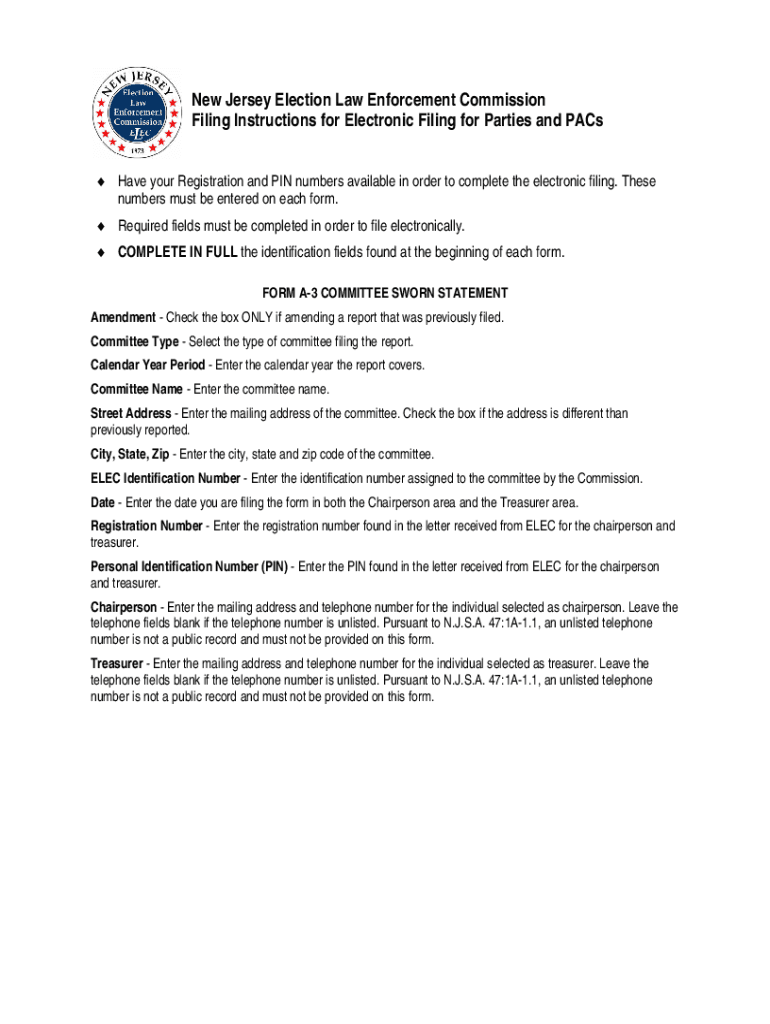 New Jersey Election Law Enforcement Commission Filing Instructions for Electronic Filing for Parties and PACs Have your Registration and Pins available in order to complete the electronic filing.