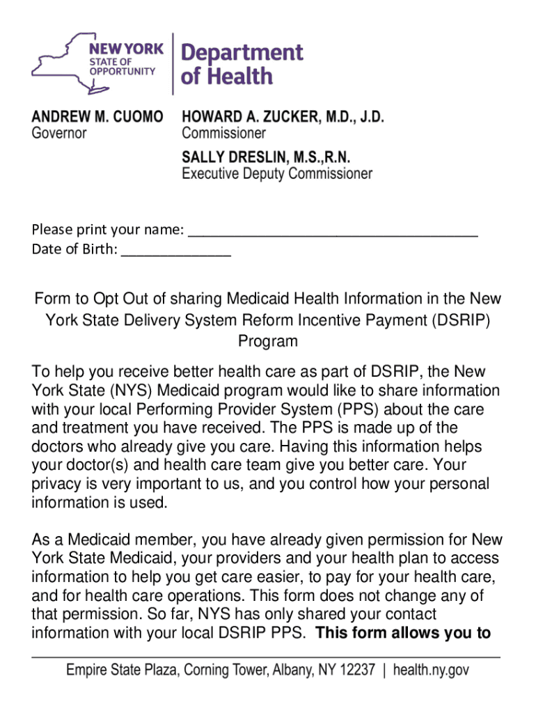 Please print your name: Date of Birth: Form to Opt Out of sharing Medicaid Health Information in the New York State Delivery System Reform Incentive Payment (DRIP) Program To help you receive better