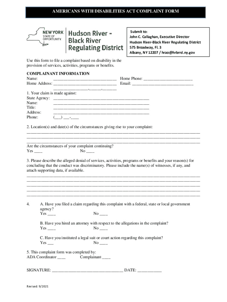 AMERICANS WITH DISABILITIES ACT COMPLAINT Resubmit to: John C. Callaghan, Executive Director Hudson Riverbank River Regulating District 575 Broadway, Fl. 3 Albany, NY 12207 / IRAO hybrid.NY.house