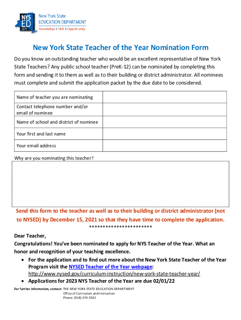 New York State Teacher of the Year Nomination Form Do you know an outstanding teacher who would be an excellent representative of New York State Teachers? Any public school teacher (PreK12) can be