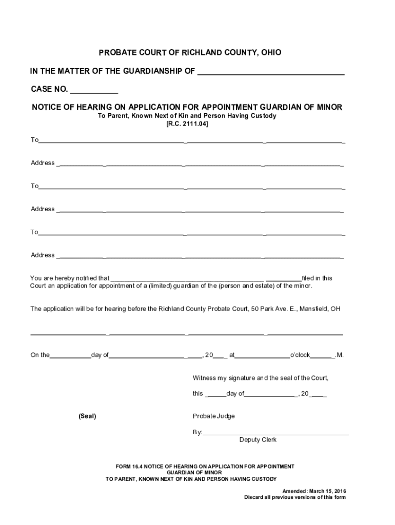 PROBATE COURT OF RICHLAND COUNTY, OHIO IN THE MATTER OF THE GUARDIANSHIP OF CASE NO. NOTICE OF HEARING ON APPLICATION FOR APPOINTMENT GUARDIAN OF MINOR To Parent, Known Next of Kin and Person Having
