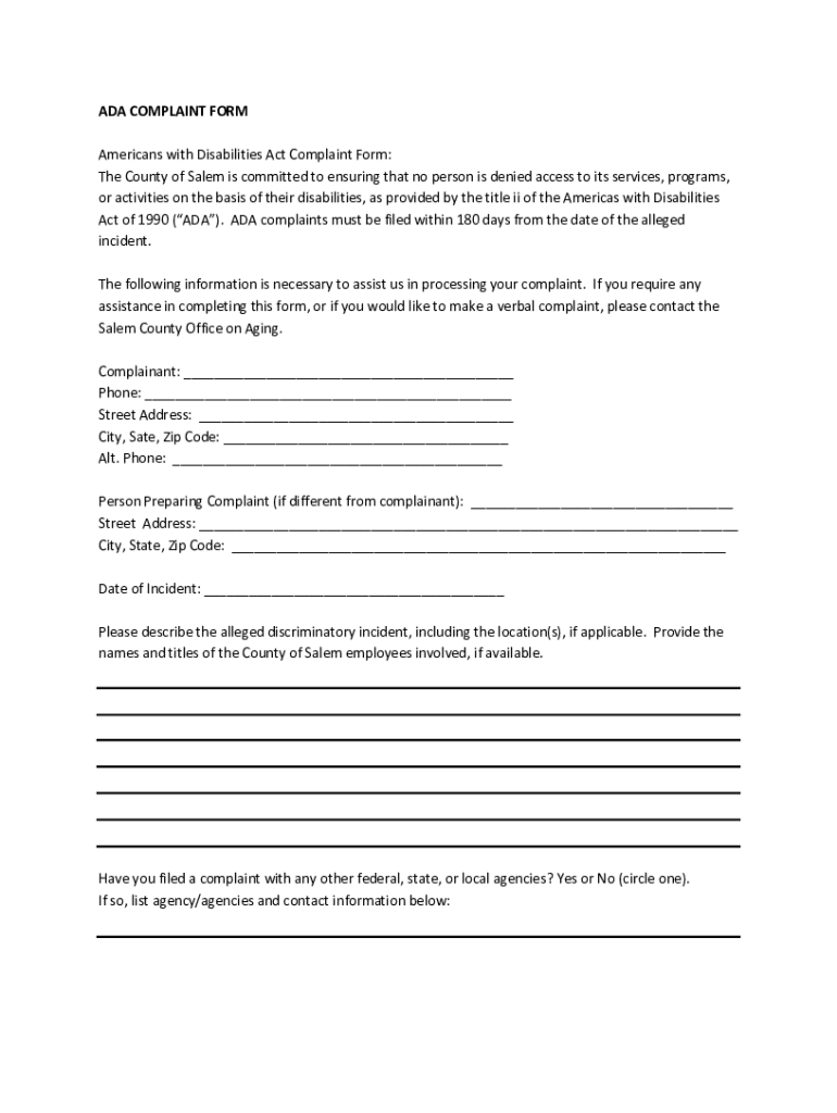 ADA COMPLAINT FORM Americans with Disabilities Act Complaint Form: The County of Salem is committed to ensuring that no person is denied access to its services, programs, or activities on the basis