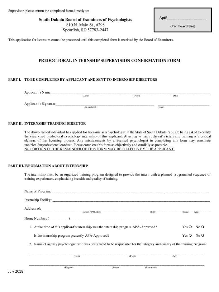 Supervisor, please return the completed form directly to: Apt# South Dakota Board of Examiners of Psychologists 810 N. Main St., #298 Spearfish, SD 577832447(For Board Use)This application for licensure
