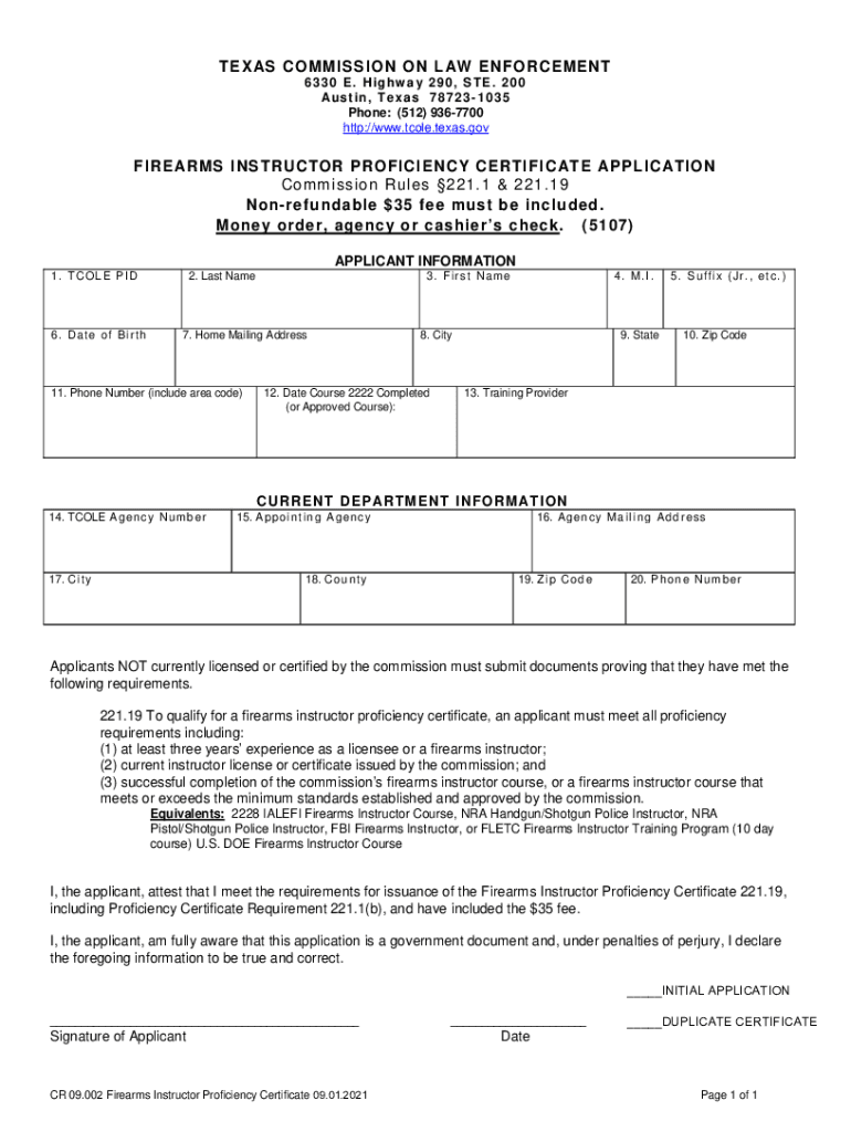 TEX AS COMMISSION ON L AW ENFORCEMENT 6330 E. Highway 290, STE. 200 Austin, Texas 787231035 Phone: (512) 9367700 http://www.tcole.texas.govFIRE ARMS I INSTRUCTOR PROFICIENCY CERTIFY C ATE APP LIC
