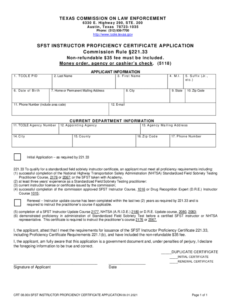 TEX AS COMMISSION ON L AW ENFORCEMENT 6330 E. Highway 290, STE. 200 Austin, Texas 787231035 Phone: (512) 9367700http://www.tcole.texas.govSFST INSTRUCTOR PROFICIENCY CERTIFICATE APPLICATION Commission
