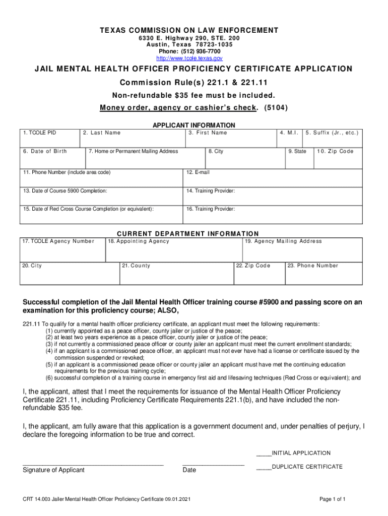 TEX AS COMMISSION ON L AW ENFORCEMENT 6330 E. Highway 290, STE. 200 Austin, Texas 787231035 Phone: (512) 9367700 http://www.tcole.texas.govJ AIL MENTAL HEALTH OFFICER PROFICIENCY CERTIFICATE APPLICATION