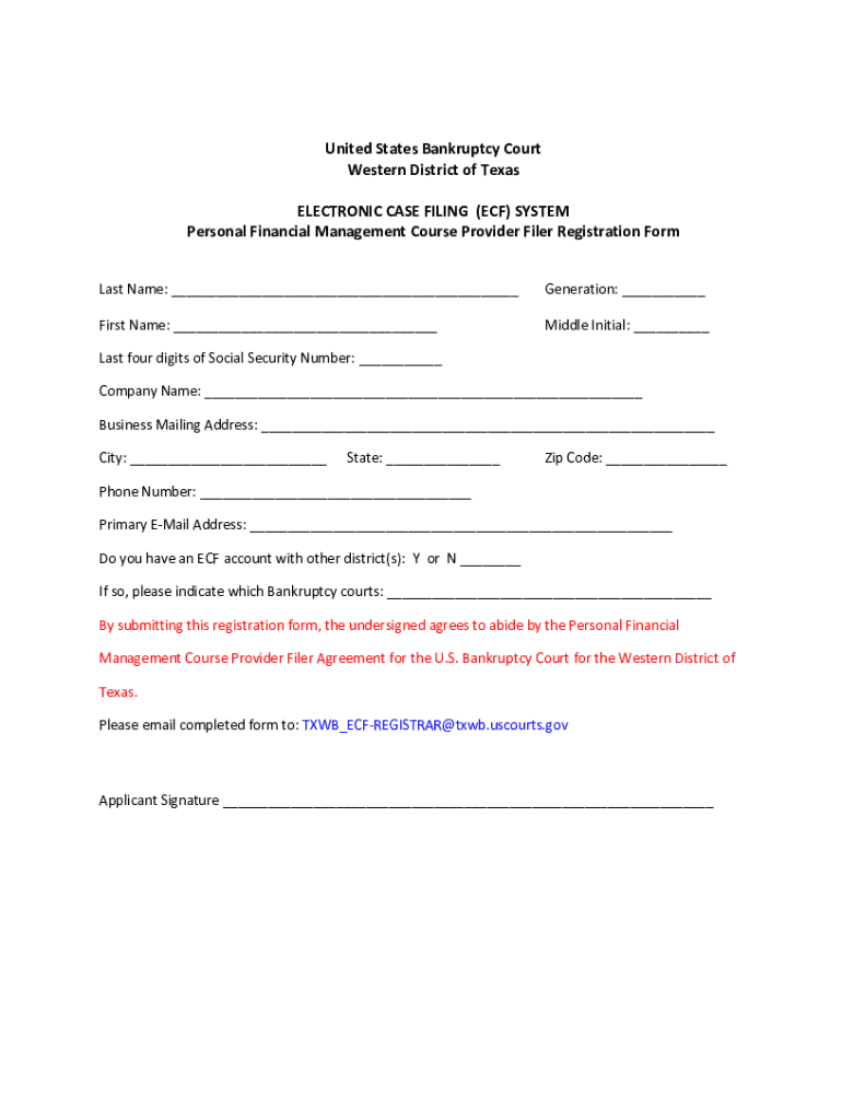 UnitedStatesBankruptcyCourt WesternDistrictofTexas ELECTRONICCASEFILING(ECF)SYSTEM PersonalFinancialManagementCourseProviderFilerRegistrationForm Hostname: Generation: Filename: MiddleInitial: LastfourdigitsofSocialSecurityNumber: