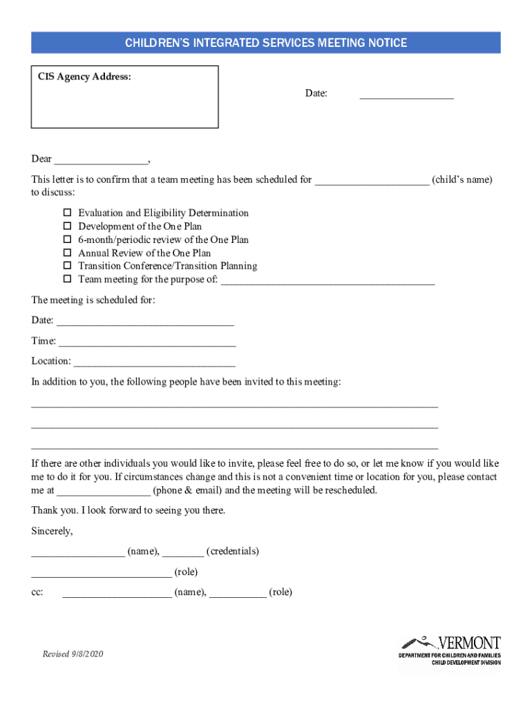 CHILDREN INTEGRATED SERVICES MEETING NOTICE CIS Agency Address:Date: Dear, This letter is to confirm that a team meeting has been scheduled for (children name) to discuss: Evaluation and Eligibility