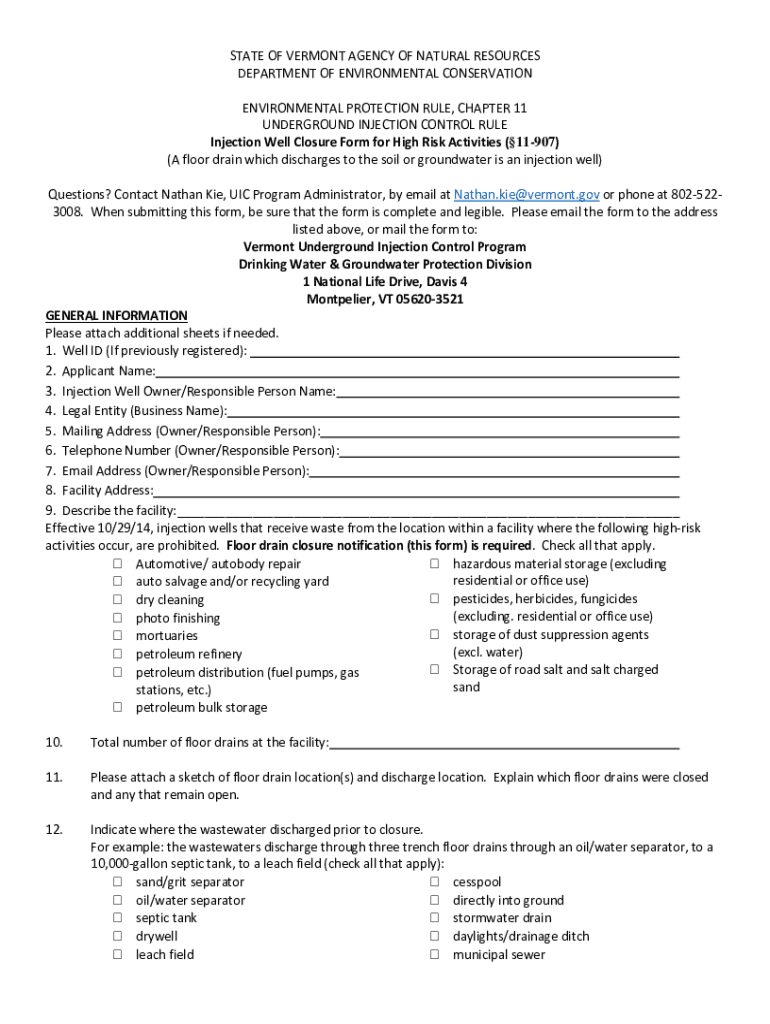 STATE OF VERMONT AGENCY OF NATURAL RESOURCES DEPARTMENT OF ENVIRONMENTAL CONSERVATION ENVIRONMENTAL PROTECTION RULE, CHAPTER 11 UNDERGROUND INJECTION CONTROL RULE Injection Well Closure Form for High