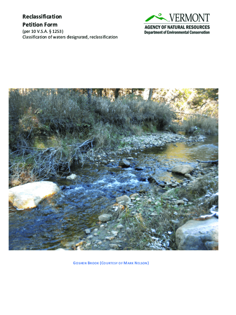 ReclassificationPetition Form(per 10 V.S.A. 1253)Classification of waters designated, reclassification ASHEN B ROOK (C COURTESY OF M ARK N NELSON)Reclassification Information and Petition Form(per