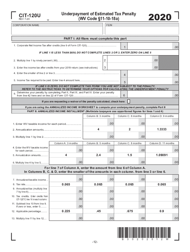 CIT120U REV 720W2020Underpayment of Estimated Tax Penalty (WV Code 111018a)CORPORATION NAMEFEINPART I: All filers must complete this part 1. Corporate Net Income Tax after credits (line 9 of Form