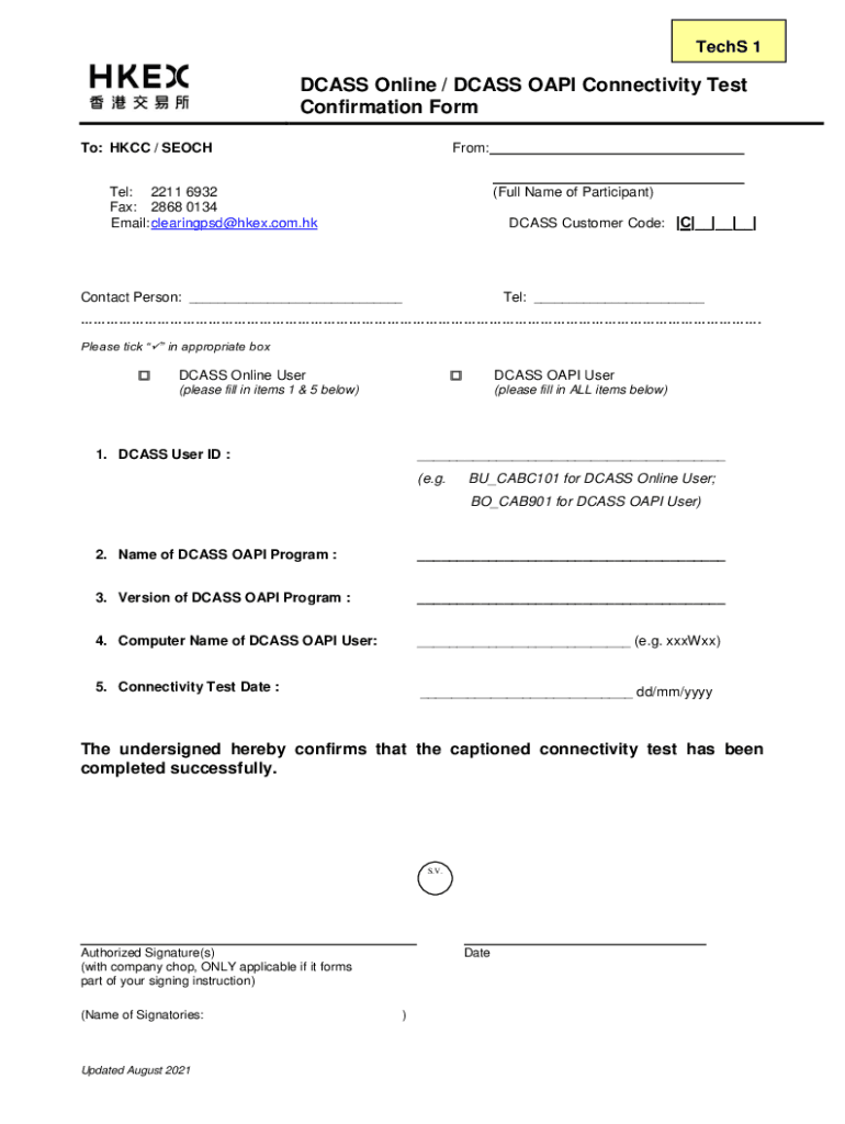 Techs 1DCASS Online / DDASS OAP Connectivity Test Confirmation Form To: HCC / SEOCHFrom:Tel: 2211 6932 Fax: 2868 0134 Email: clearings hkex.com.HK(Full Name of Participant) DDASS Customer Code: C