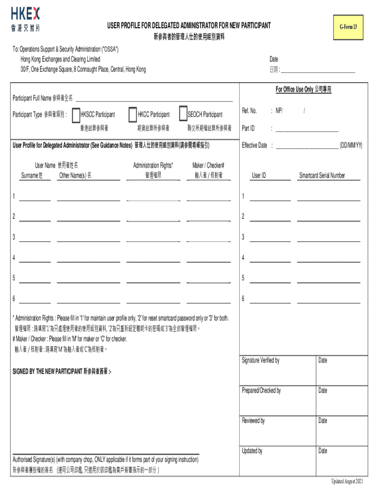 USER PROFILE FOR DELEGATED ADMINISTRATOR FOR NEW PARTICIPANT To: Operations Support & Security Administration (\” SSA\”) Hong Kong Exchanges and Clearing Limited 30/F, One Exchange Square, 8 Conn
