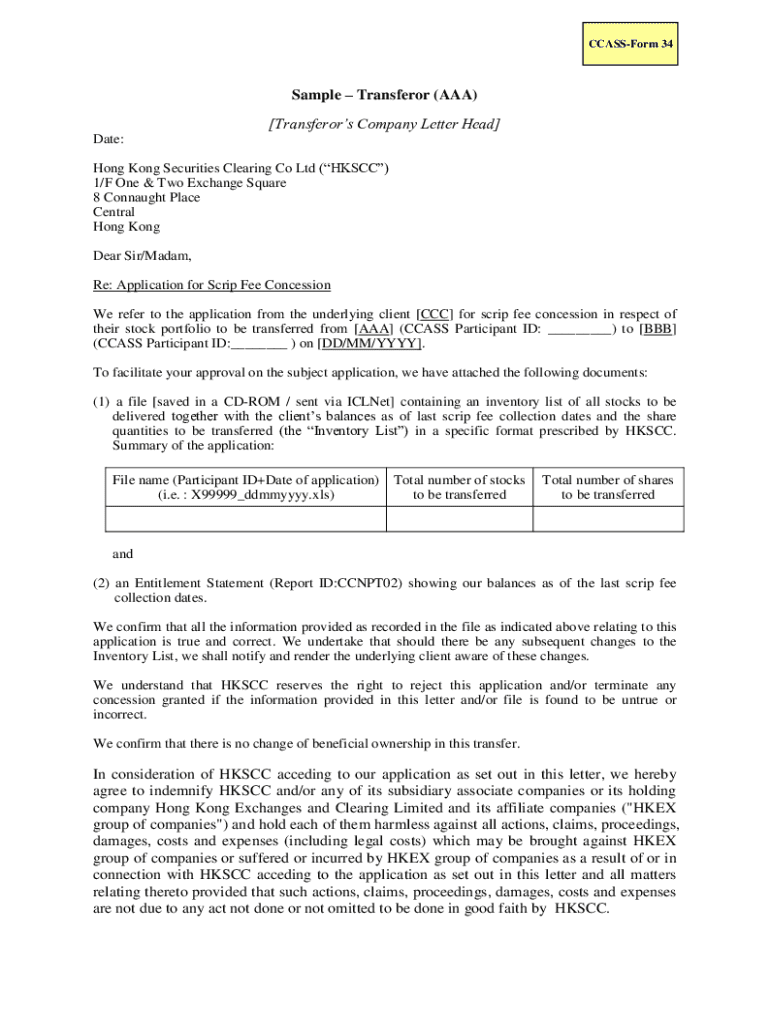 Classroom 34Sample Transferor (AAA) Transferors Company Letter Head Date: Hong Kong Securities Clearing Co Ltd (HK SCC) 1/F One & Two Exchange Square 8 Conn aught Place Central Hong Kong Dear Sir/Madam,