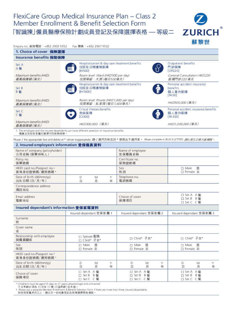 Flexible Group Medical Insurance Plan Class 2 Member Enrollment & Benefit Selection Form Inquiry no. +852 2903 9352Fax +852 2967 95321. Choice of cover Insurance benefits Set A Hospitalization & day